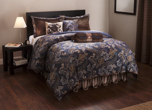 Luxurious queen size (88-inch by 92-inch)English Laundry Ashton paisley and velvet duvet set . English Laundry paisley duvet cover framed with brown velvet border which reverses into a deep blue wave jacquard. Hidden button closures.